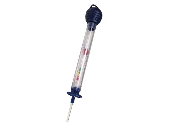 Accuzuurweger Gefo Centra, universeel werkplaatsapparaat, degelijke uitvoering met kunststof cilinder zonder verdikking. Werkt met een kleine hoeveelheid vloeistof. Grote drijver met goed afleesbare schaalindeling, met kleur en cijferindeling. Drijver blijft na inzuigen niet schommelen en plakt niet vast aan de wand door speciale afstandhouder.