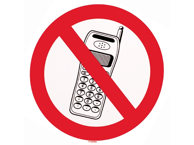 Sticker van zacht pvc met een rood doorstreepte telefoon. Deze sticker geeft aan dat op die locatie bellen verboden is.