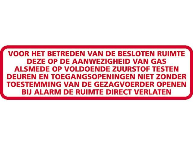 Rechthoekige sticker van zacht PVC met onderstaande tekst. Voor het betreden van de besloten ruimte deze op de aanwezigheid van gas alsmede….