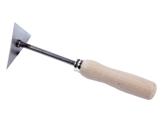 Driekant schrapper met blad van gehard staal en voorzien van stalen steel met gelakt houten handvat.