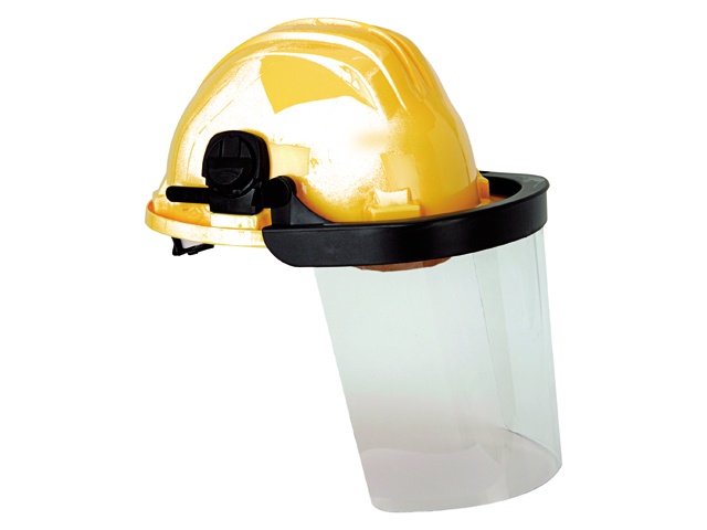 Gelaatsscherm met helmbevestiging, eenvoudig gelaatsscherm voorzien van helmbevestiging.