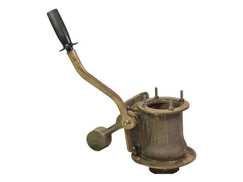 Cilindrisch model van ramin of tauari, geheel geschuurd, blank gelakt en voorzien van kunststof of houten druif. Bootshaak van kunststof.