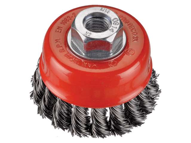 Getordeerde komborstel van ambachtelijke kwaliteit voor gebruik op haakse slijpers. Voor het verwijderen van verf, roest en slakken.
