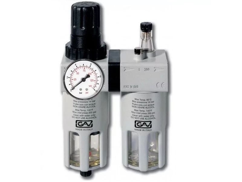 Luchtverzorgingsunit van GAV met filterdrukregelaar, waterafscheider en olienevelaar. Instelknop met vergrendelfunctie. Maximaal 16 bar ingaand. Instelbare druk van 0-12 bar.