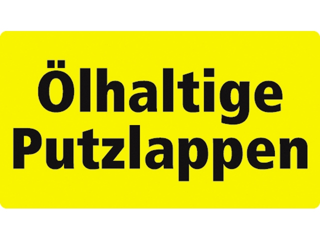 Gele sticker van zacht PVC met zwarte tekst “Ölhaltige putzlappen”.