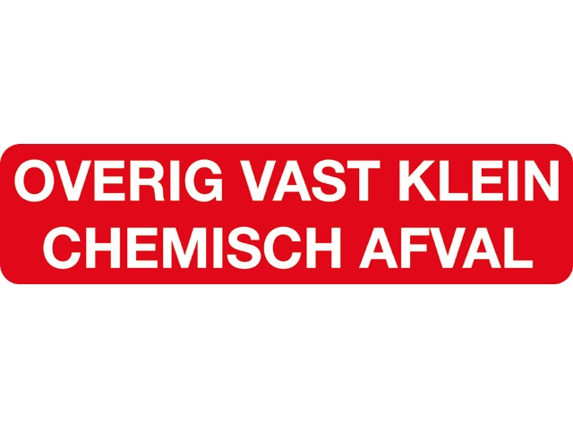 Rode sticker van zacht PVC met de tekst “OVERIG VAST KLEIN CHEMISCH AFVAL” in witte letters.