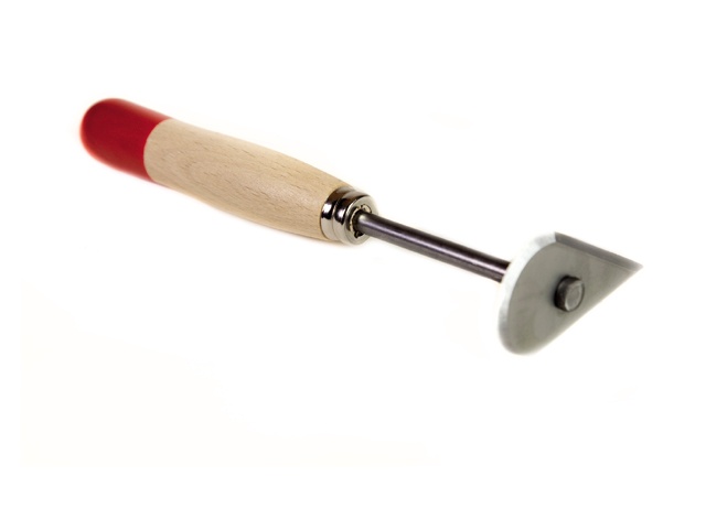 Driekant schrapper met blad van gehard staal en voorzien van stalen steel met gelakt houten handvat.