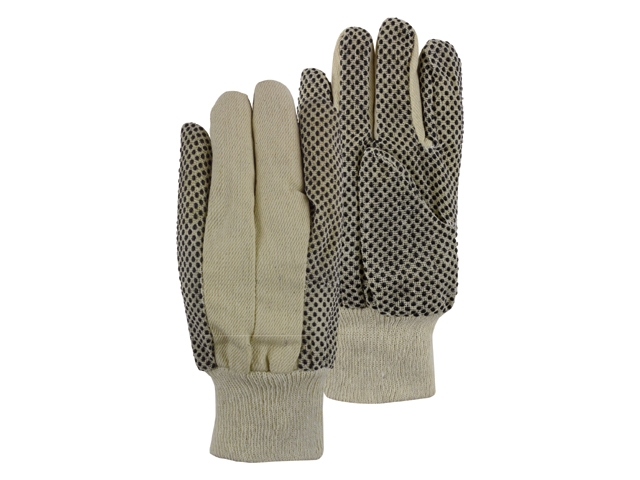 Geweven katoenen werkhandschoen voorzien van PVC noppen voor goede grip. Voorzien van tricot manchet voor prettige aansluiting aan de pols.