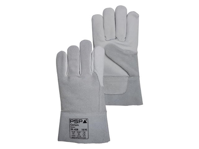 De PSP Corium Welder 34-408 is een TIG lashandschoen met een A-kwaliteit rundnerflederen palm van 1,0 – 1,2 mm dikte en een A-kwaliteit splitlederen rug en kap (kaplengte 8 cm) van 1,0 – 1,2 mm. Deze handschoen heeft een totale lengte van 28 cm. De kritische naden zijn paspoil versterkt. De handschoen is voorzien van een splitlederen polsversterking en is ongevoerd. De handschoen is vrij van Chromium VI en PCP.