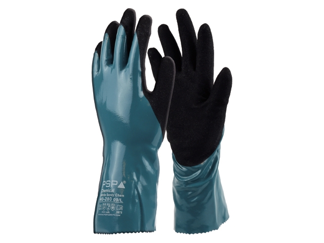 De PSP 40-280 Chemical Nitrile Sandy Chem is een chemisch bestendige handschoen met nitril coating en met additionele, geruwde nitril coating in de handpalm voor een ultieme grip. Het