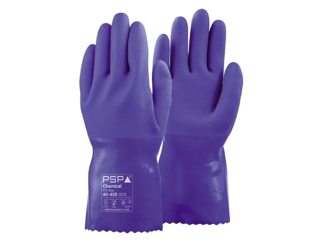 De PSP 40-400 Chemical PVC Blue is een chemisch bestendige PVC handschoen. Door de speciale PVC formule een drievoudige bescherming tegen olie t.o.v. de reguliere PVC handschoenen. Deze handschoen is ‘Triple Dipped’ voor een uitstekende olie-, loog- en zuurbestendigheid. De ruwe (Sandy) finish zorgt voor een goede grip in alle omstandigheden. Ook bij lage temperaturen is deze handschoen uitermate soepel. De 13 G katoenen liner aan de binnenzijde zorgt voor een fijn en koel gevoel en is antibacterieel behandeld en hierdoor geurvrij.