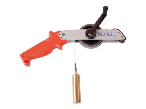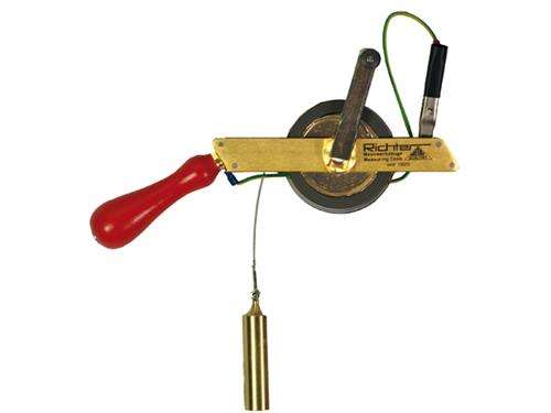 Tankrolbandmaat met RVS of Glasfiber rolband en doorlopende schaalverdeling op messing gewicht. Houder van aluminium met greep van slagvast kunststof en vernikkelde stalen slinger.