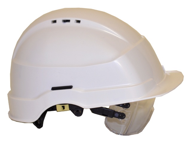 Bril zit aan de helm vast en kan bijna onzichtbaar omhoog schoven worden in de voorkant van de helm. Volgens eisen Arbeidsinspectie en DIN 4840.