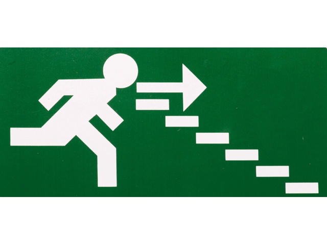 Groende sticker met afbeelding van persoon in vluchtrichting.