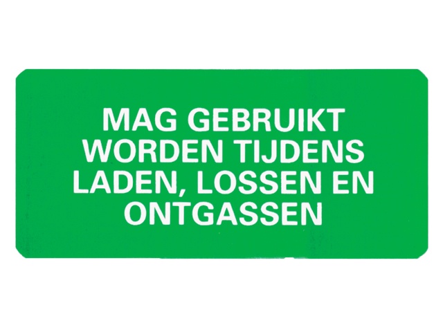 Groene sticker van zacht PVC met de tekst “MAG GEBRUIKT WORDEN TIJDENS LADEN, LOSSEN EN ONTGASSEN”.